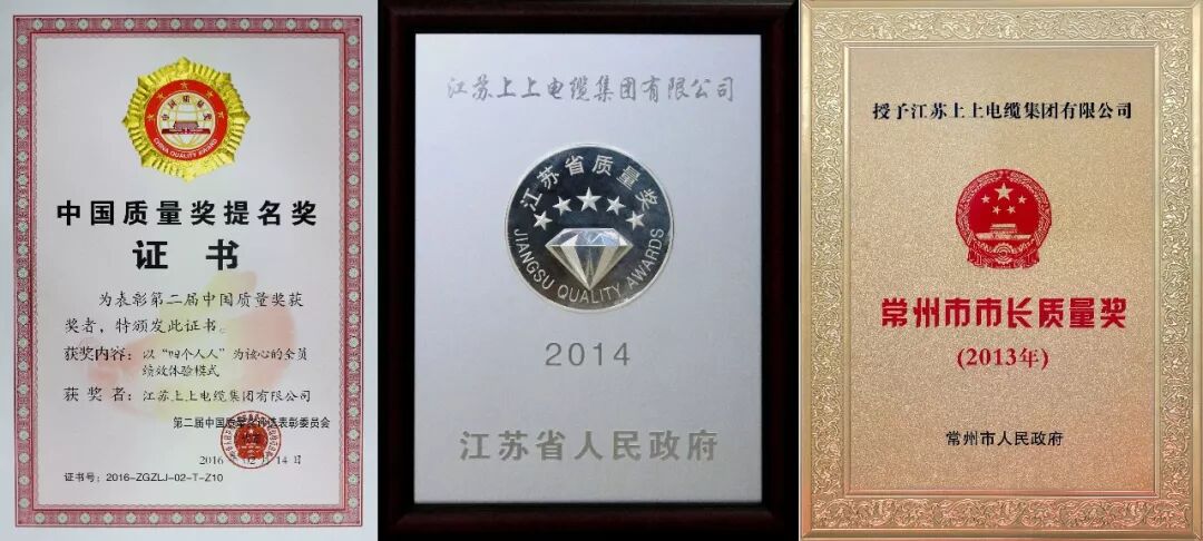 超高压远程CIMS系统 2016年,上上与上海电力公司等单位共同研发了电缆行业首个中压电缆远程监控系统,用户在家就可以监测到产品质量生产的全过程,生产过程都是现场直播。有一点瑕疵也逃不过用户眼睛,所以真的要做到万无一失。今年,我们的生产控制系统准备上线,完成后,将实现生产数据的可追溯,在行业里将又是一个突破。可以说,为了保证质量、提高质量,上上不惜工本。事实上,我也是一直带着私心在抓质量,为什么这么说,质量摆在桌面上,是为了用户,但归根结底是为了我们自己。做好了,就有市场、有用户,做不好,就是兄弟也不敢用你的产品。所以说归根到底是为了我们自己。所以质量一定要确保万无一失,否则就是一失万无。 常州市、江苏省、国家质量奖证书、奖牌 付出总会有回报,通过多年努力,我们从认识质量、追求质量、提升质量走到了享受质量。上上品质得到社会和政府的认可,先后获得“常州市市长质量奖”、“江苏省质量奖”、第二届、第三届“中国质量奖提名奖”。上上产品对市场产生了吸引力,经济发展进入新常态后,制造业都是供大于求,竞争更加激烈,但上上仍然能保持稳步增长,这就是市场对质量的回报,市场也开始向优质产品、优质企业集聚。