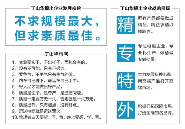 人诚品优是上上的核心价值观。其中品优就是产品质量一定要让用户放心、满意。上上的目标就是不给用户添麻烦,把电缆埋下去就可以忘了。 电缆有两个特点,一是看起来黑乎乎的,其貌不扬,做起来非常不容易,都是动态定型、动态控制,不是拍胸脯、拍脑袋就能做好的。二是它的作用非常了不起,动力电缆就是血管,控制电缆就是神经,核电、化工、冶金、煤矿等任何场合使用,一旦哪出了问题,整个系统都要受影响。就是现在的普通住宅,没电了,没电梯、没电视、没空调,不能做饭,人都没法过,所以电缆的作用太重要了。就像空气一样,它正常的时候你感觉不到它的存在,一旦出问题,你也没法活了。电都要靠咱们电缆来输送,虽然说咱们是配角,但是这个配角太重要了。 上上一直坚持“质量兴企”,产品质量被看作企业的生命(现在千真万确,就是企业的生命)、员工的饭碗,质量比天大,质量是尊严,如果上上产品质量不好,说实话,我这个董事长也没尊严。没尊严,那还不如不干,要干就要干得有尊严。质量提升上更是下硬功夫、笨功夫、真功夫。从1987年开始,上上就在行业率先实施“质量一票否决制”,凡是发现问题必须返工重来。2004年,又引入卓越绩效管理模式,目的就是通过科学手段确保产品质量。2011年,上上建成电缆行业世界领先水平的超高压电缆集控系统,超高压电缆质量实现全过程控制。